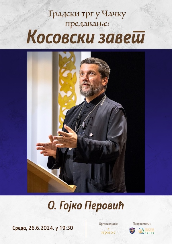 Predavanje sveštenika Gojka Perovića na temu “Kosovski zavet“, u organizaciji udruženja “Irmos“, a pod pokroviteljstvom Grada Čačka i Turističke organizacije Čačak, biće održano na Gradskom trgu u Čačku u sredu, 26. juna 2024. godine sa početkom u 19:30h.