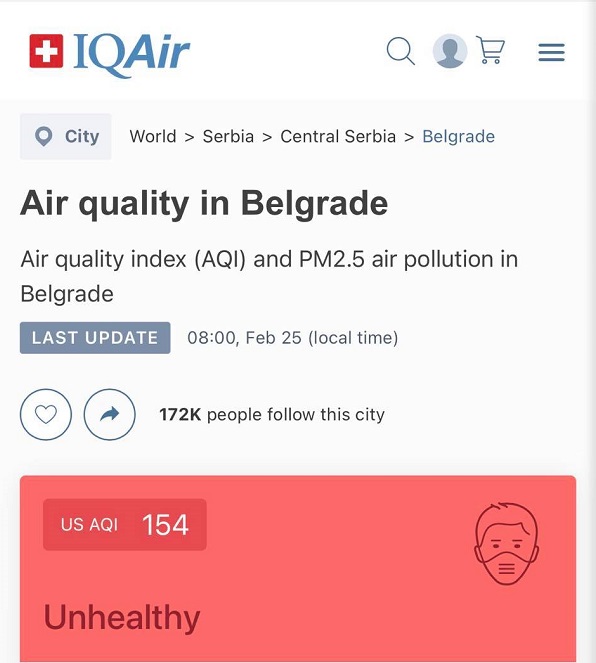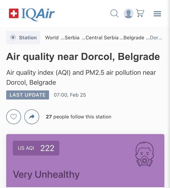 Tako uz Gornji Milanovac stoji brojka 221, a uz Dorćol 222. Dakle, ako ne biste da vas zaboli glava, da osetite stezanje u grudima, a posebno ako imate neku hroničnu bolest pluća, poput astme ili opstruktivne bolesti, ne mrdajte iz kuće.