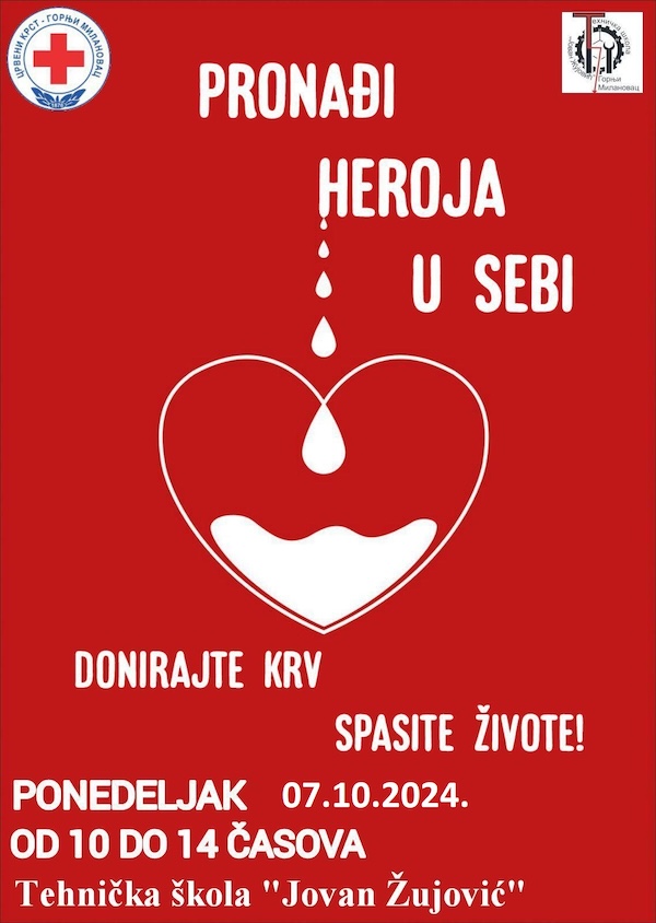 Crveni krst Gornji Milanovac i Zavod za transfuziju krvi Kragujevac – u osnivanju organizuju akciju Dobrovoljnog davanja krvi u ponedeljak 7. oktobra 2024. godine u Tehničkoj školi „Jovan Žujović“ u terminu od 10 do 14 časova.