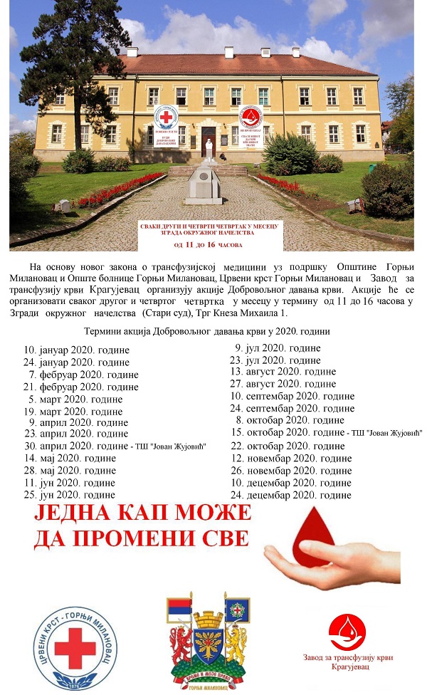 Crveni krst Gornji Milanovac i Zavod za transfuziju krvi Kragujevac (u osnivanju) organizuju akciju Dobrovoljnog davanja krvi u četvrtak 5. marta 2020. godine u Zgradi okružnog načelstva (Stari sud) od 11 do 16 časova.