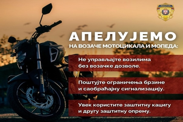 Ministarstvo unutrašnjih poslova Srbije uputilo je apel vozačima motocikala i mopeda i vozačima drugih vozila da poštuju saobraćajne propise da bi bila sačuvana bezbednost saobraćaja.