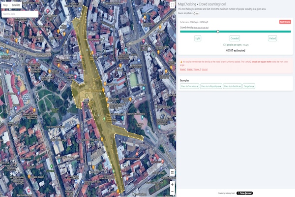 Gustinu okupljene mase odredili smo poređenjem sa prošlogodišnjim skupom ProGlasa na istom mestu, kada smo imali na raspolaganju odgovarajući vizuelni materijal za ručno obeležavanje i brojanje svih učesnika. Tada smo na tom prostoru utvrdili prosečnu gustinu od 1,9 ljudi po kvadratnom metru. Komparativnom analizom dostupnih snimaka sa visine, procenili smo da je, u odnosu na taj skup, na protestu 10. avgusta prosečna gustina bila nešto niža – između 1,7 i 1,8 ljudi po kvadratnom metru.