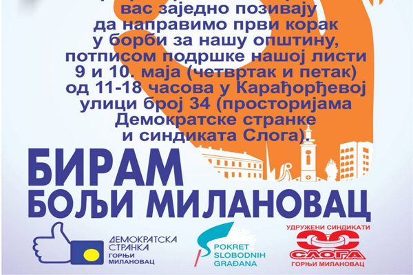 Potpisi podrške listi će se prikupljati u četvrtak 9. maja i petak 10. maja od 11 do 18 časova u Karađorđevoj ulici broj 34 (prostorije DS i sindikata Sloga).*