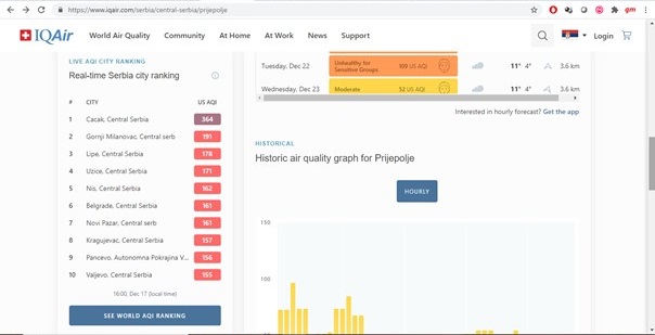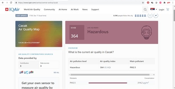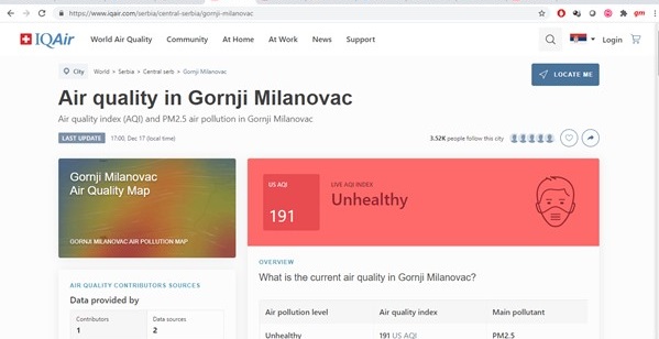Prema poslednjim podacima od 17 časova, na sajtu www.iqair.com, Čačak je u Srbiji na 1. mestu po zagađenosti, a Milanovac na drugom.
