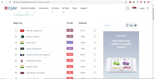 Poređenja radi, najzagađeniji na svetu su trenutno Bishkek, (Kirgistan) sa 488, a iza njega su Lahor (Pakistan) 360µg/m³ i Delhi, (India) 280.