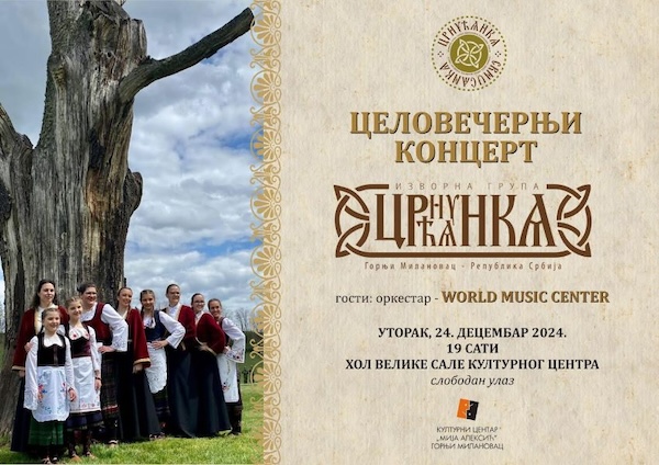 Izvorna pevačka grupa „Crnućanka“ organizuje u utorak, 24. decembra 2024. godine u velikoj sali Kulturnog centra „Mija Aleksić“celovečernji koncert.