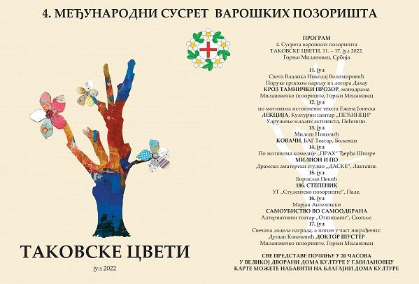 Milanovačko pozorište uz podršku Kulturnog centra, a pod pokroviteljstvom Opštine Gornji Milanovac i kompanija “Metalac” AD i “Rudnik i flotacija – Rudnik” i drugih preduzeća od 11. – 17. jula 2022. godine organizuje u gradu na Despotovici Međunarodni susret varoških pozorišta “Takovske cveti” – četvrti po redu.
