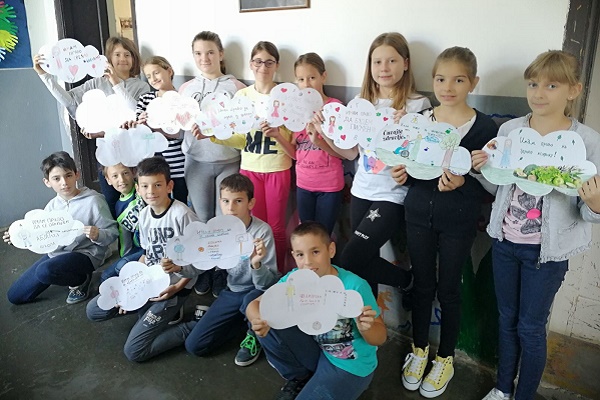 Manifestacija je otvorena čitanjem dečijih prava na srpskom i francuskom jeziku i dečijim škrabom u školskom dvorištu.