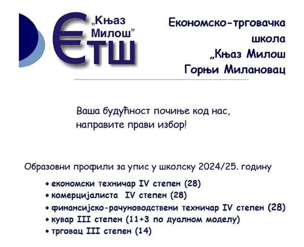 Ekonomsko-trgovačka škola „Knjaz Miloš“, za narednu školsku godinu, ima u planu da upiše po jedno odeljenje ekonomskih tehničara, komercijalista i finansijsko-računovodstvenih tehničara na četvrtom stepenu, kao i kombinovano odeljenje kuvar/trgovac na trećem stepenu.