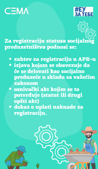 Za registraciju socijalnog preduzeća neophodno je podneti zahtev za registraciju u APR-u, priložiti izjavu kojom se obavezuje da će se delovati kao socijalno preduzeće u skladu sa važećim zakonom, kao i osnivački akt kojim se to potvrđuje (statut ili drugi opšti akt) i dokaz o uplati naknade za registraciju.