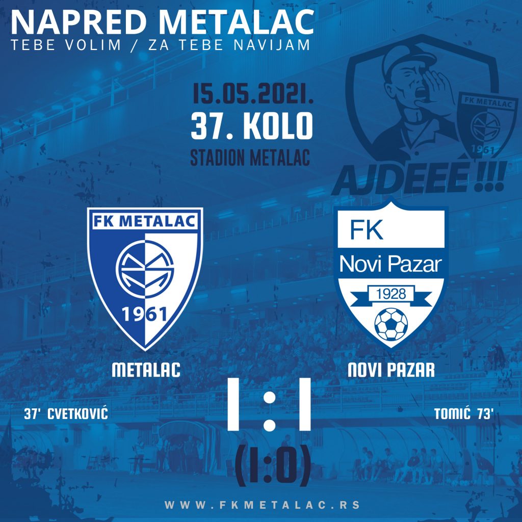 Metalac je poveo iz kontranapada u 37. minutu golom Stefana Cvetkovića. Mogao je doći i do novog gola da je Prestiž iskoristio svoju stopostotnu šansu ubrzo potom. Remi donosi Branislav Tomić glavom u 73. minutu. Kako je istakao Lazetić, Metalac je primio gol usled nepažnje, zapravo lanca grešaka, kojih inače nije bilo mnogo u dobro postavljenoj i požrtvovanoj odbrani plavih, manje-više hladnokrvnoj do kraja pod konstatnim napadima Novog Pazara. Minutom ćutanja pre početka meča, odata je juče i svečana pošta nedavno tragično preminulom prijatelju kluba i sportskom fotografu Miroslavu Jelisavčiću Piku.