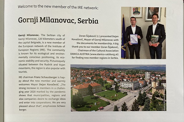– Od velikog značaja za razvoj gornjomilanovačke opštine u narednom periodu biće podsticaji za umrežavanje u Evropi kroz više od 130 regija, gradova i kompanija koje podržavaju IRE kao i lični sastanci sa predsedavajućim IRE prof. dr. Franz Schausberger, bivšim guvernerom države Salcburg, kako bi se definisao koncept saradnje po meri između našeg regiona i IRE – istakao je Dejan Kovačević, predsednik opštine Gornji Milanovac i dodao – zahvaljujući članstvu Instituta za regione Evrope, Gornjem Milanovcu će biti omogućen pristup stručnim i istraživačkim aktivnostima IRE (decentralizacija i regionalizacija, publikacije, naučni radovi itd), kao i besplatno učešće u svim aktivnostima IRE, piše u saopštenju.