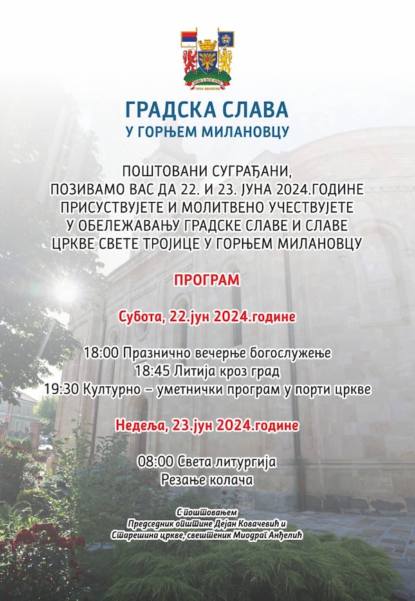 Poštovani sugrađani, pozivamo vas da 22. i 23. juna 2024. godine prisustvujete i molitveno učestvujete u obeležavanju gradske slave i slave Crkve Svete Trojice, poručuju iz kabineta predsednika opštine G. Milanovac.