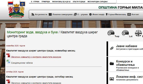 Parametri prikupljeni sa pomenutih opštinskih mernih stanica prikazani su na linku zvanične web stranice lokalne samouprave Milanovca https://www.gornjimilanovac.rs/ekoloska-monitoring-vazduh.html. Poslednji podaci, u trenutku objavljivanja ovog teksta, su iz novembra prošle godine.