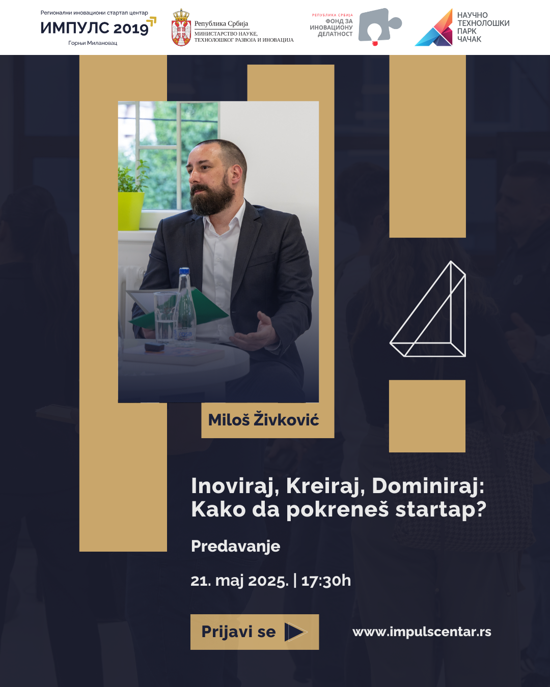 U sredu, 21. maja, sa početkom u 17:30 časova, u prostorijama Regionalnog inovacionog startap centra Impuls 2019 u Gornjem Milanovcu biće održano predavanje pod nazivom „Inoviraj, kreiraj, dominiraj: Kako da pokreneš startap“. Događaj je namenjen svima koji razmišljaju o pokretanju startapa, ali nisu sigurni kako da naprave prvi korak, ili se pitaju da li njihova ideja zaista ima potencijala na tržištu.