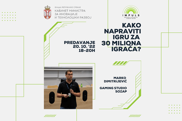 Regionalni inovacioni startap centar Impuls, u četvrtak 20. oktobra, od 18 do 20 sati, priprema za sve ljubitelje gejming industrije predavanje pod nazivom “Kako napraviti igru za 30 miliona igrača?”.
