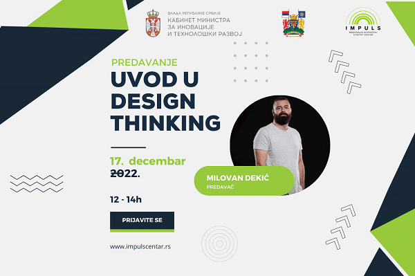 Regionalni inovacioni startap centar Impuls organizuje, 17. decembra, od 12 do 14 sati, predavanje „Uvod u Design Thinking“ sa ciljem približavanja inovativnih metodologija koje mogu uticati na ubrzani razvoj poslovanja.