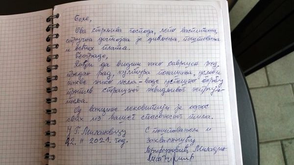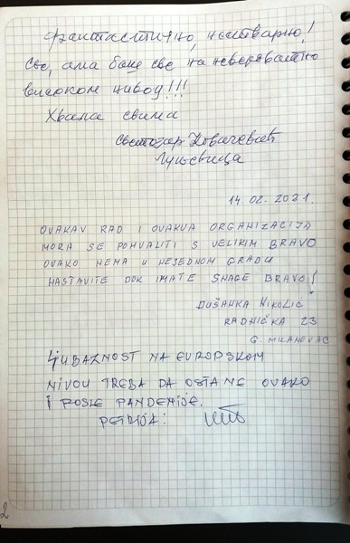 Osim toga, neka zapažanja sugrađani su ostavili i u Knjizi utisaka, koja stoji u holu. „Od vakcine lekovitiji je odnos svih iz vašeg spasonosnog tima“; „Vrhunska organizacija, čistoća, ljubaznost…“; „Sve najlepše reči upućuje Vam Marijana, ćerka Vere i sestra Aleksandra, koji su bili kod Vas;“ „Savršeno organizovano, hvala na požrtvovanosti,“ piše u nekim od poruka koje šire prenosimo fotografijama.