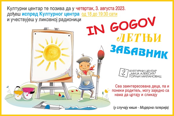 Za mališane Gornjeg Milanovca i njihove roditelje, Kulturni centar „Mija Aleksić“ organizuje u četvrtak, 3. avgusta 2023. godine, od 18 sati, na platou ispred Starog suda likovnu radionicu naziva „In Gogov letnji zabavnik“.