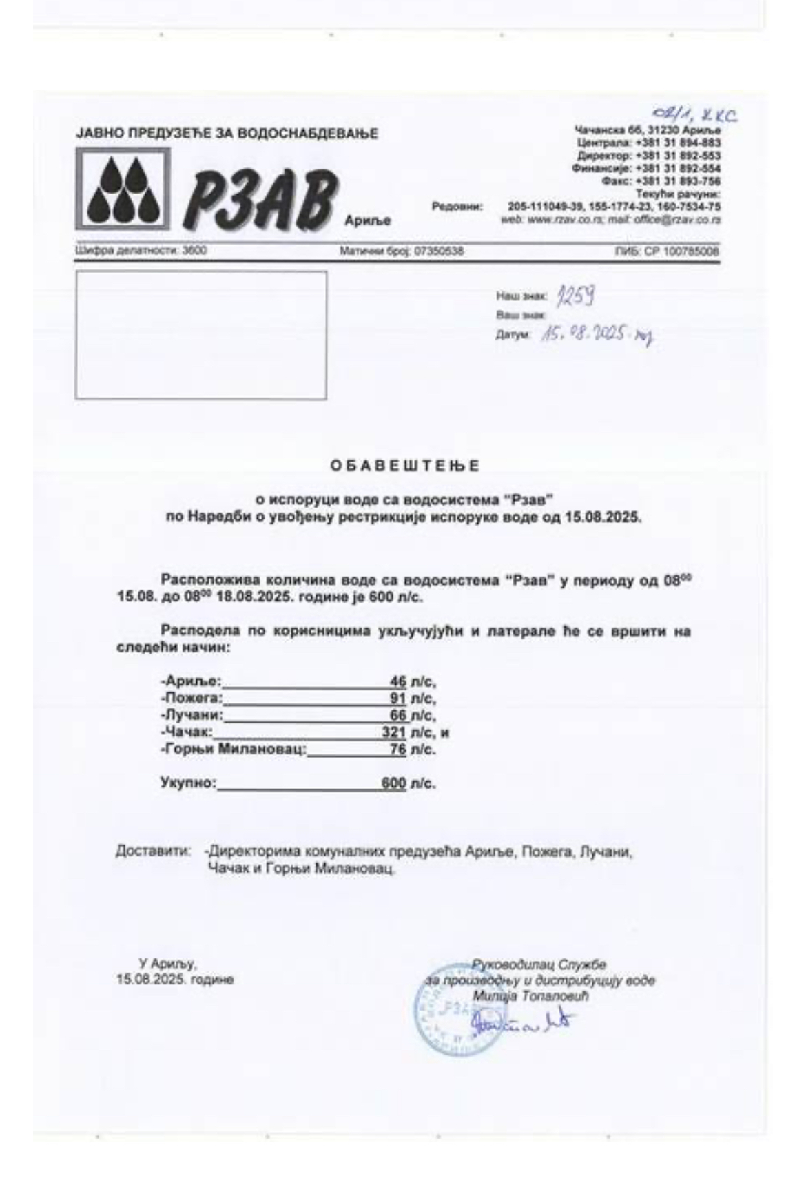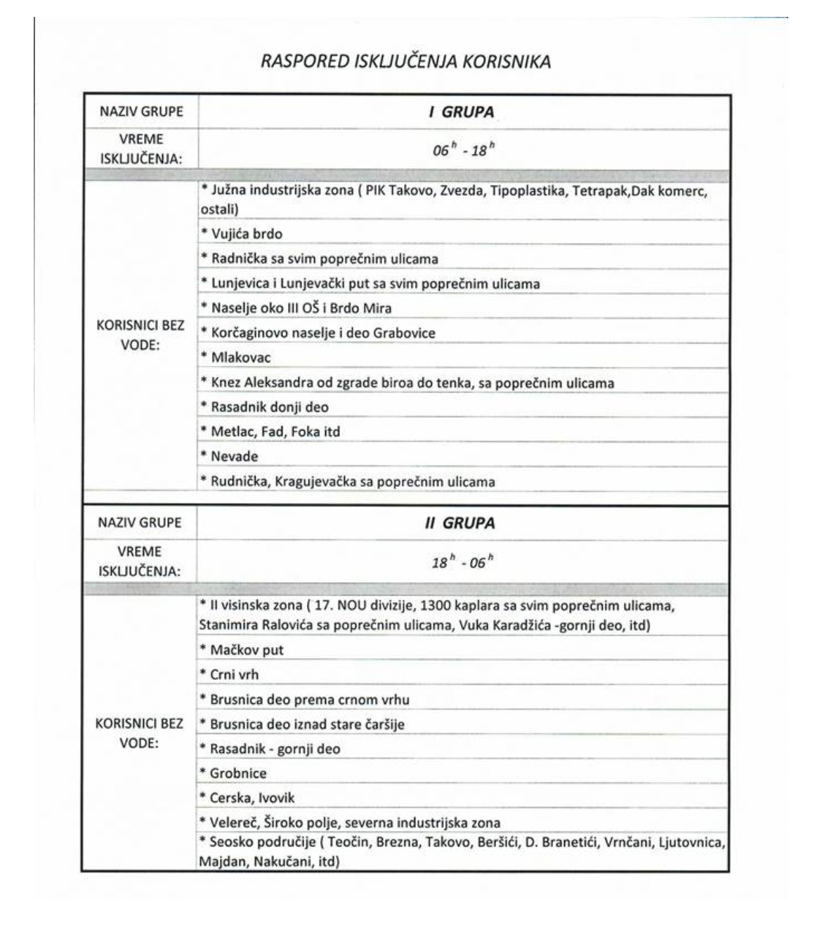 Nekoliko minuta nakon što je objavljena naša vest „Veliki broj domaćinstava bez vode – odgovora nadležnih još nema“, JKP „Gornji Milanovac“ dostavilo je link sa rasporedom isključenja vode zbog smanjenja raspoložive količine na izvorištima.
