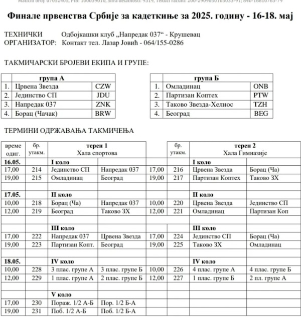 U prvom kolu koje se igra u petak, 16. maja od 19 časova čeka ih „Partizan Kopteh“ iz Beogada, dok se sutradan u drugom kolu od 12 časova sastaju sa ekipom „Beograd“. Istoga dana u okviru trećeg kola od 19 časova protivnik će im biti ekipa „Omladinac“ iz Novih Banovaca.