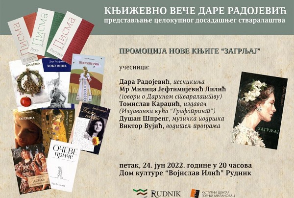Kompanija „Rudnik i flotacija – Rudnik“ uz podršku Kulturnog centra organizuje u petak, 24. juna 2022. godine u Domu kulture „Vojislav Ilić“ na Rudniku književno veče Dare Radojević.