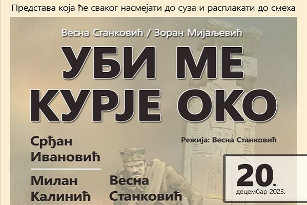 Komedija: „Ubi me kurje oko“ u produkciji „Balkan Novi pokret“ i režiji Vesne Stanković u sredu, 20. decembra 2023. godine biće izvedena na sceni Kulturnog centra „Mija Aleksić“ u Gornjem Milanovcu.