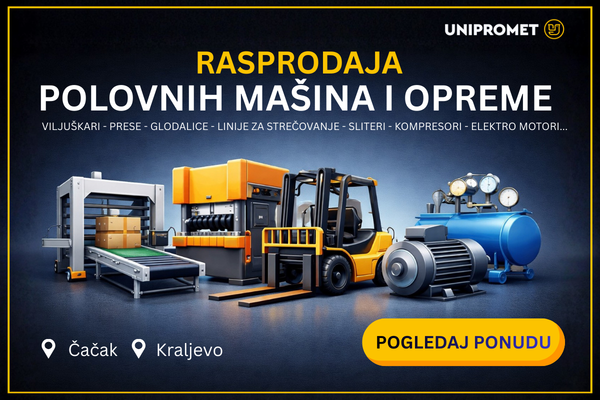 Privredno društvo Unipromet d.o.o. Čačak oglašava prodaju korišćene opreme i radnih mašina koje su bile u redovnoj upotrebi u okviru poslovnih aktivnosti kompanije.
