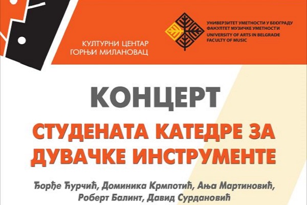 Fakultet muzičke umetnosti Beograd i Kulturni centar Gornji Milanovac organizuju u utorak, 10. maja 2022. godine u holu ispred Velike sale koncert studenata Katedre za duvačke instrumente.