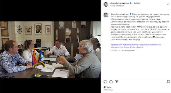 „Odličan sastanak sa predstavnicima JVP ‘Srbijavode’, koji su me upoznali da je počelo obeležavanje trase za rekonstrukciju korita reke Despotovice sa pešačkim stazama, što znači da su radovi zvanično otpočeli“, naveo je Kovačević.