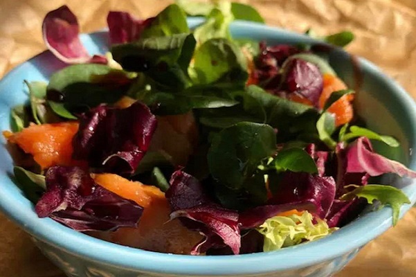 Oprani batat skuvati ili ispeći u rerni umotan u alu foliju. Kada se batat ohladi oljuštiti, iseći na sitnije kockice staviti u posudu za salatu. Oprati matovilac odstraniti koren ukoliko već nije očišćen. Radič oprati, preseći na pola, pa uzdužno iseći na trake, a potom na sitnije kockice, pomešati sa batatom. Blago začiniti, so, biber, maslinovo ulje i par kapi sosa od nara. Promešati da se sjedine sastoci. Jesti uz sir, hrskavi hleb, humus, tofu, kukuruz šećerac.