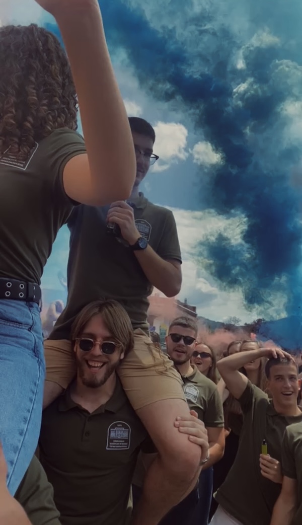Učenici četvrtog razreda Gimnazije Takovski ustanak“ proslavili su danas poslednji dan u školskim klupama, u dobrom raspoloženju, uz pesmu, igru i zvuke truba.