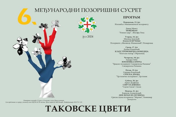 Šesti međunarodni pozorišni susret – „TAKOVSKE CVETI“ u organizaciji Milanovačkog pozorišta biće realizovan od 15. do 21. jula 2024. godine u velikoj sali Kulturnog centra “Mija Aleksić” u Gornjem Milanovcu.
