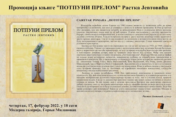 U Modernoj galeriji Kulturnog centra u četvrtak, 17. februara 2022. godine biće predstavljena knjiga Rastka Jevtovića “Potpuni prelom”.
