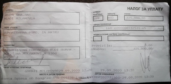 Prikupljeni novac će se iskoristiti za kupovinu leka Zolgensma i troškove lečenja, kao i za putne troškove i smeštaj. Anikina porodica se obraća svim dragim ljudima dobre volje da u ovome pomognu. Za lečenje ovom terapijom potrebno je prikupiti nešto više od dva miliona eura.