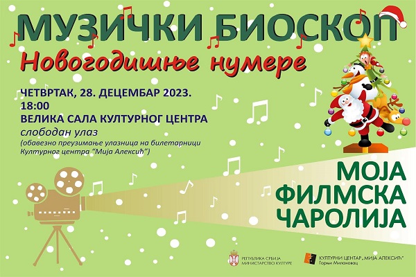 Kulturni centar „Mija Aleksić“, za decu Gornjeg Milanovca organizuje u četvrtak, 28. decembra 2023. godine u velikoj sali Novogodišnji muzički bioskop.