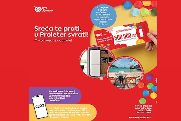 🎁 Glavna nagrada – Vaučer u vrednosti od čak 500.000 dinara za kupovinu u DTL Proleteru. Sa ovim vaučerom, možete sebi priuštiti sve što vam je potrebno, a što se nalazi u Proleterovim prodavnicama!