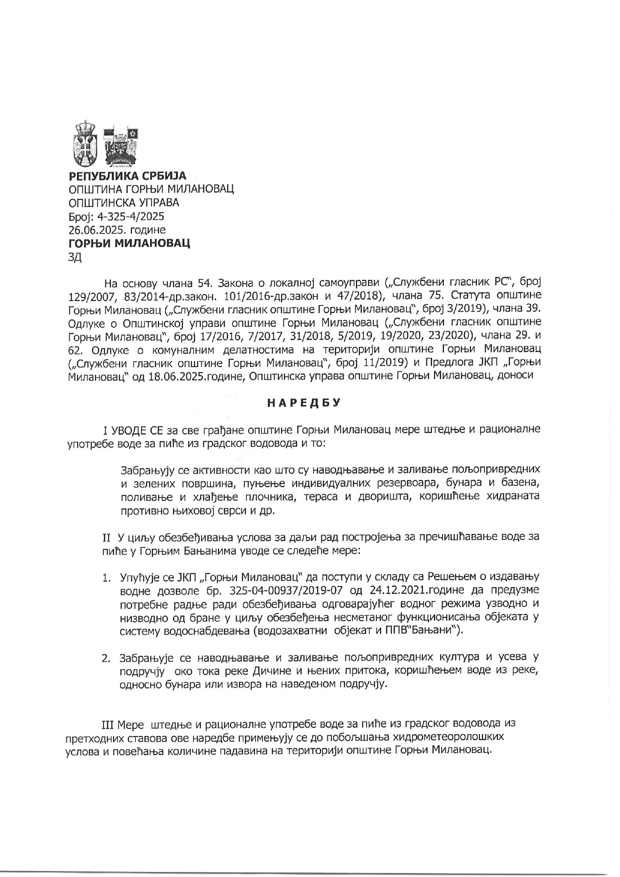 Opštinska uprava opštine Gornji Milanovac je na predlog JKP ,,Gornji Milanovac“ od 18.06.2025. godine donela Naredbu (br. 4-325-4/2025) kojom se za sve građane opštine Gornji Milanovac uvode mere štednje i racionalne upotrebe vode za piće iz gradskog vodovoda.