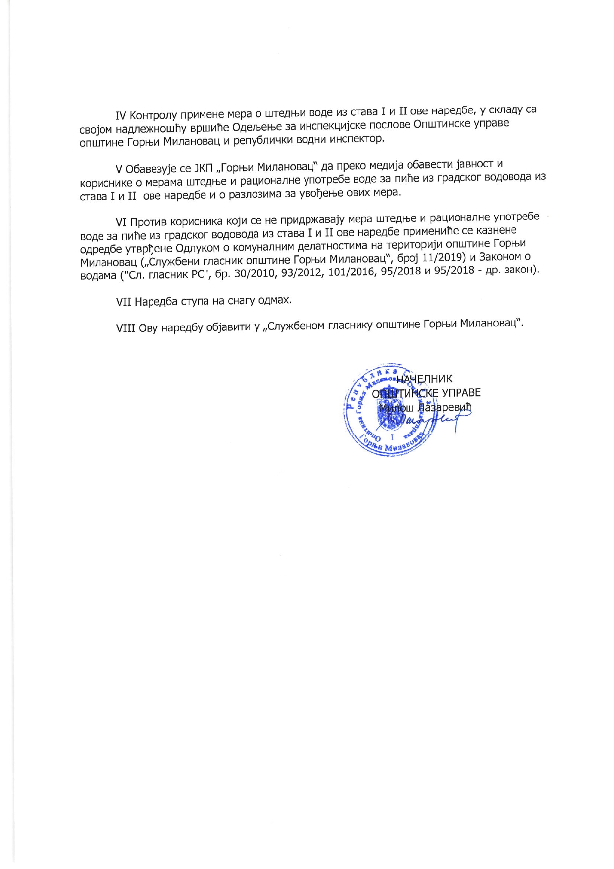 Mere štednje i racionalne upotrebe vode za piće iz gradskog vodovoda iz prethodnih stavova ove naredbe primenjuju se do poboljšanja hidrometeoroloških uslova i povećanja količine padavina na teritoriji opštine Gornji Milanovac.
