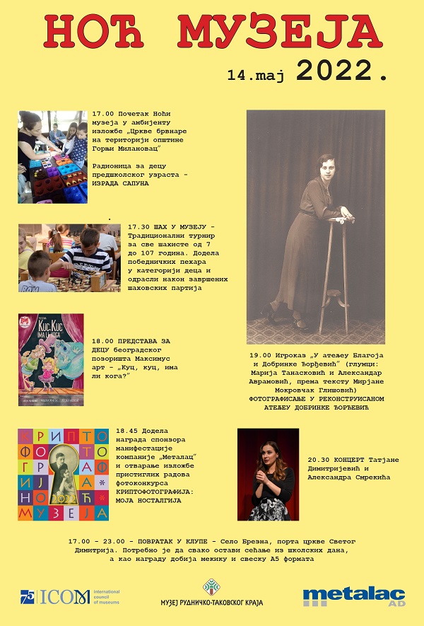 Početak Noći muzeja, u Muzeju rudničko-takovskog kraja, u ambijentu izložbe „Crkve brvnare na teritoriji opštine Gornji Milanovac”, zakazan je 14. maja, od 17 sati, kao i radionica za decu predškolskog uzrasta – IZRADA SAPUNA.