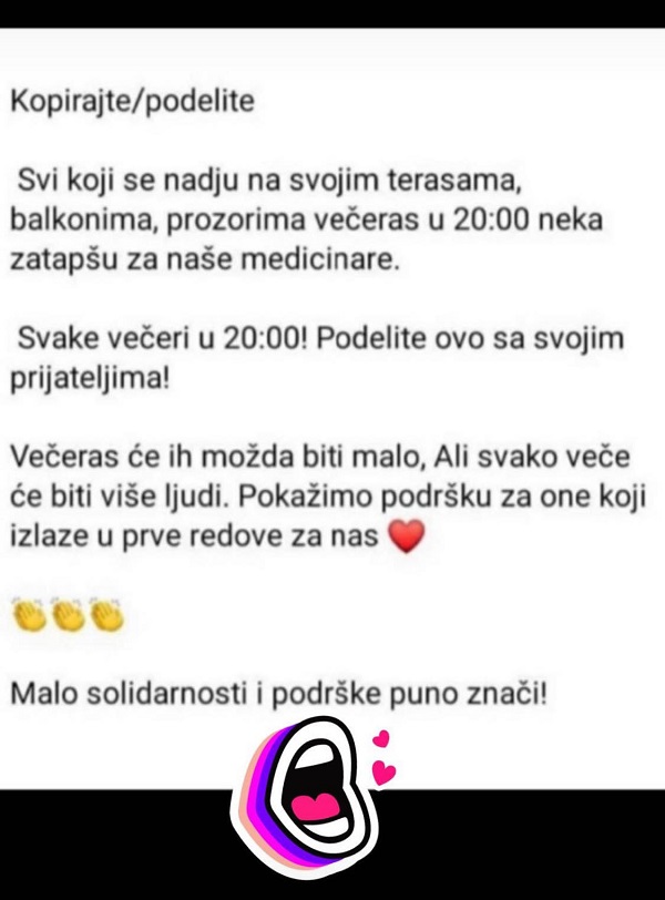 Svi koji se nađu na svojim terasama, balkonima, prozorima večeras u 20 časova neka zatapšu za naše medicinare. Svake večeri u 20 časova! Podelite sa svojim prijateljima!