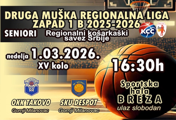 GORNJI MILANOVAC – U okviru XV kola Druge muške regionalne lige Zapad 1 B, košarkaši OKK Takovo dočekuju ekipu SKU Despot u utakmici koja obećava veliku borbu na parketu milanovačke hale.