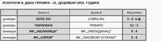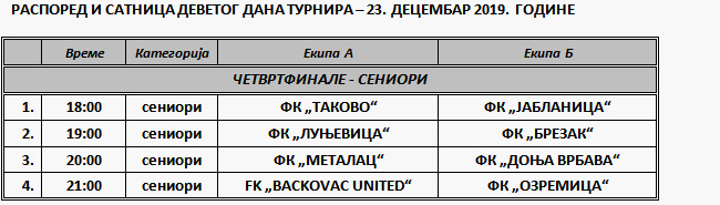 U seniorskoj konkurenciji plasman u četvrtfinale izborile su ekipe: FK „TAKOVO“, FK „BREZAK“, FK „METALAC“, FK „OZREMICA“, FK „LUNjEVICA“, FK „JABLANICA“, FK „BACKOVAC UNITED“ i FK „DONjA VRBAVA“.