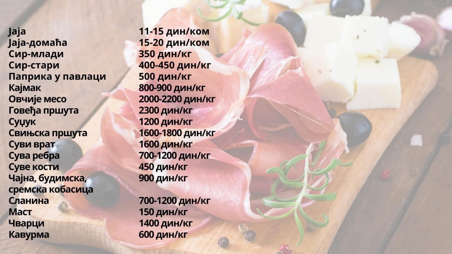 – Mladi luk vezica 40, Crni luk 60, crni luk džak 10kg 700, beli luk (džak) 800, beli luk vezica 60, beli luk glavica 20-30, praziluk 150, krompir 80, krompir krompir mladi 100-300, krompir džak 600-700