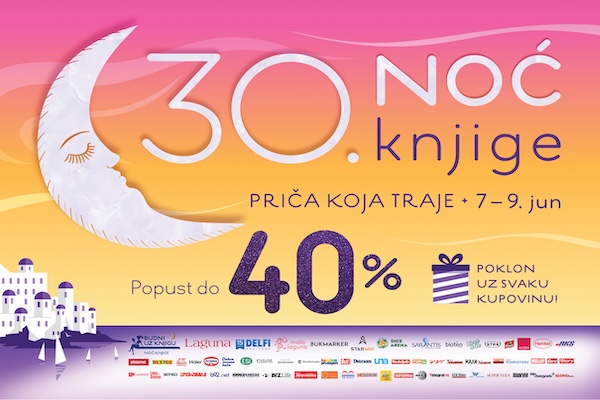 Omiljena manifestacija svih koji vole knjigu i čitanje, jubilarna 30. Noć knjige održaće se od 7. do 9. juna 2024. godine u knjižarama Delfi i Laguninim klubovima čitalaca u Srbiji i regionu, kao i na sajtovima laguna.rs i delfi.rs.