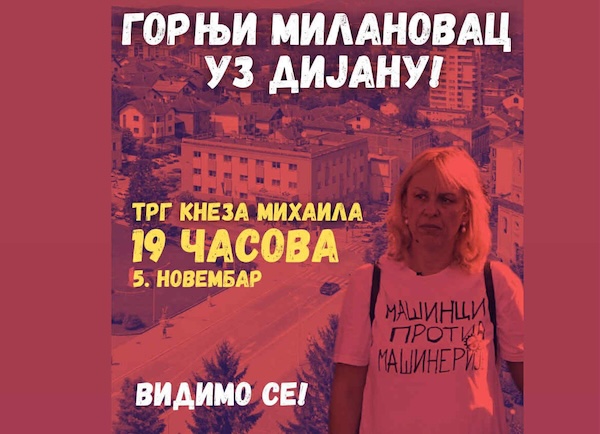 Samoorganizovana grupa studenata iz Gornjeg Milanovca pozvala je preko društvenih mreža sugrađane da im se pridruže na protestu podrške Dijani Hrki, koji će biti održan večeras, u sredu 5. novembra, u 19 časova na Trgu kneza Mihaila.
