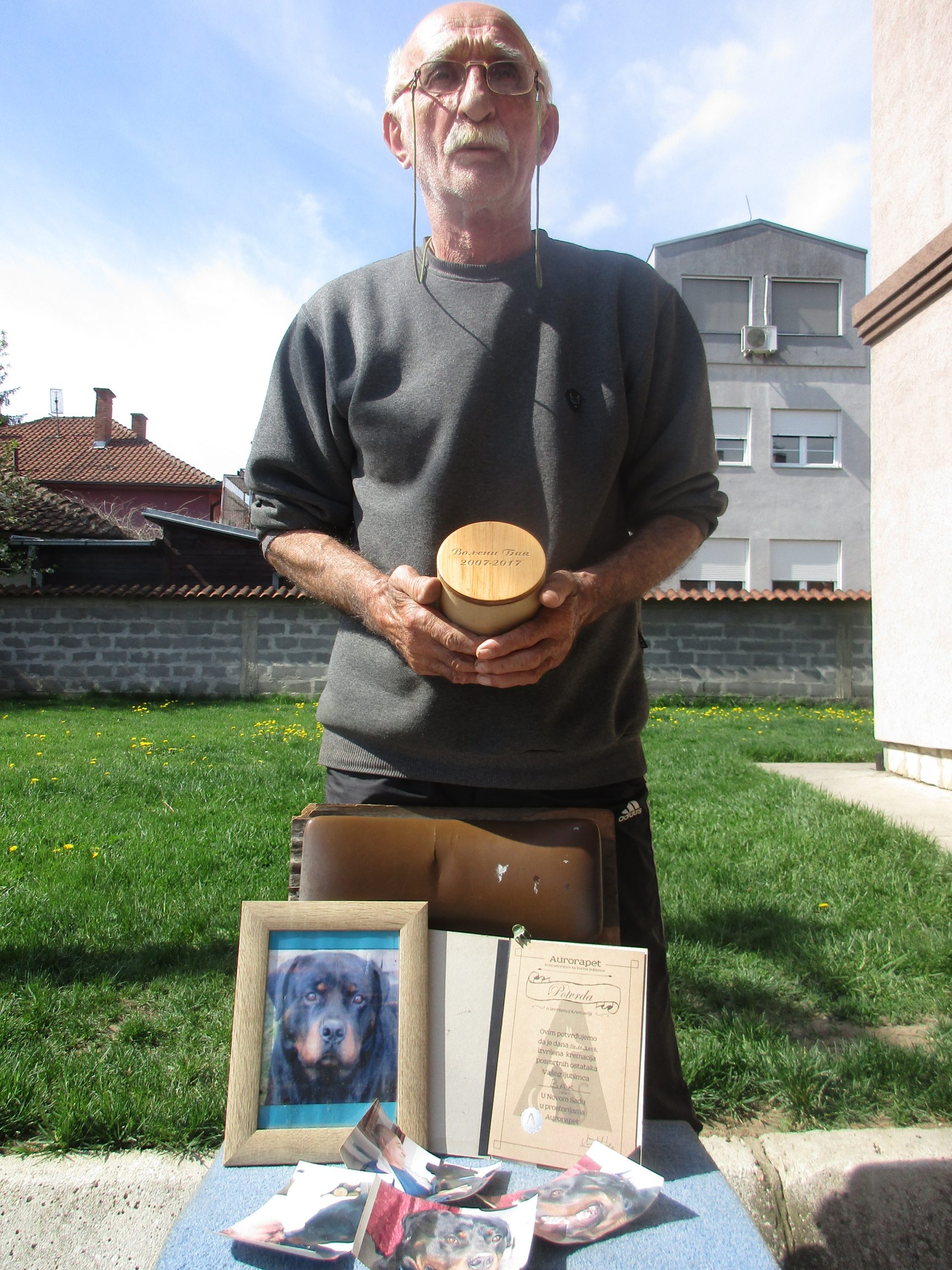 – I SAD kao da gledam, kako Bak nestaje iz života… Bio je sa mnom u garaži. Ustade, pođe napolje, legne kod vrata i tiho izdahne. A nije bolovao ni od čega, redovno je vakcinisan. Nismo hteli da ga zakopamo. Našli smo firmu „Aurorapet“ u Novom Sadu, koja se bavi kremacijom kućnih ljubimaca. Njeno osoblje je specijalnim vozilom došlo po Bakov leš, obavilo kremiranje, donelo nam urnu i prateće dokumente. Nije nam žao tih troškova, ama kako bi i bilo, zaslužio je on mnogo više – tužno veli naš sagovornik.