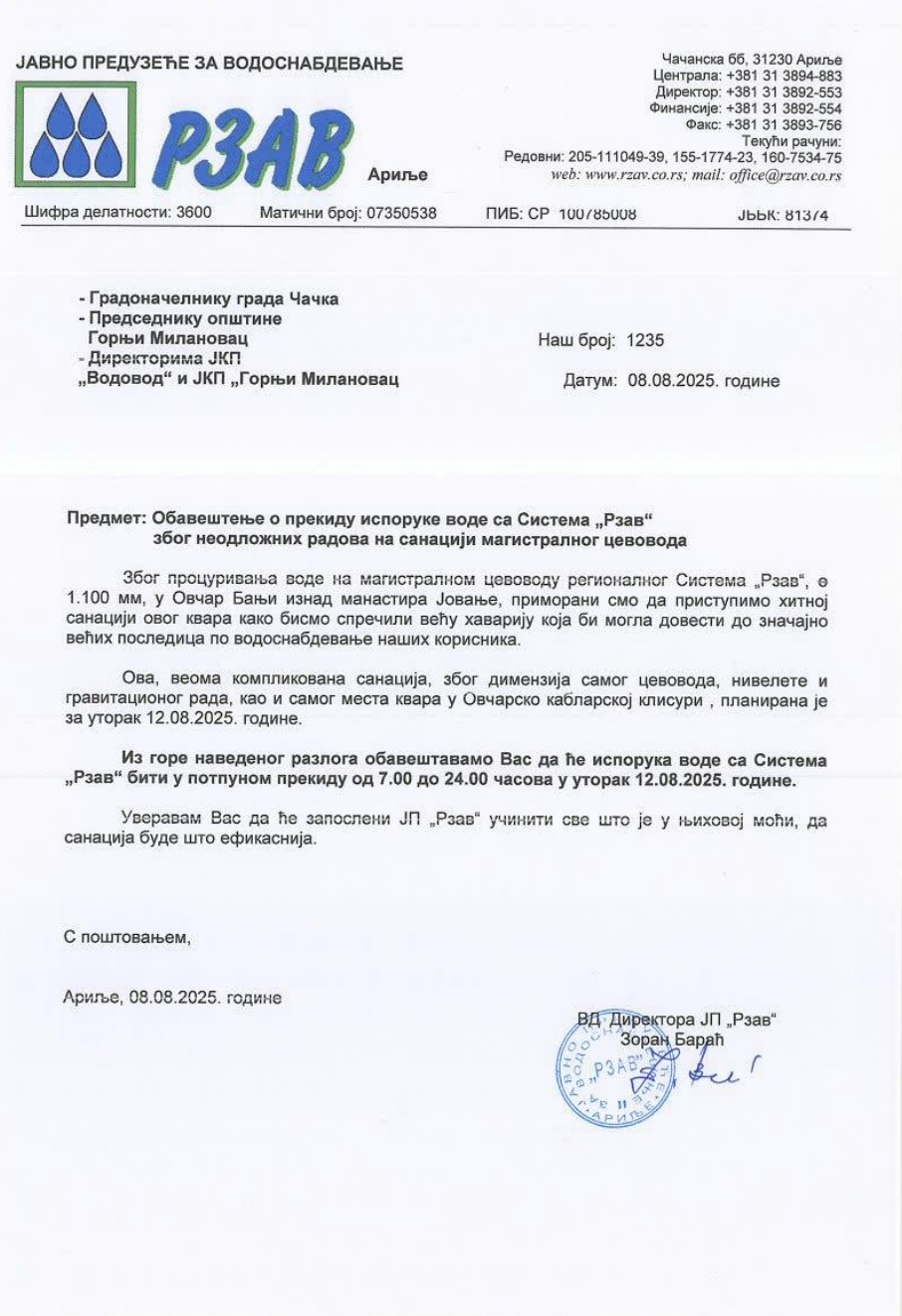 Na Facebook stranici opštine Gornji Milanovac danas je objavljeno saopštenje JP „Rzav“ o potpunom prekidu isporuke vode 12. avgusta 2025. godine zbog sanacije kvara na magistralnom cevovodu u Ovčar Banji. Iz Kabineta predsednika opštine Gornji Milanovac dodaje se da područja koja će imati vodu u ovom periodu, uz maksimalno racionalno korišćenje, su prigradska i seoska naselja koja vodu dobijaju iz banjanskog i brezanskog sistema.