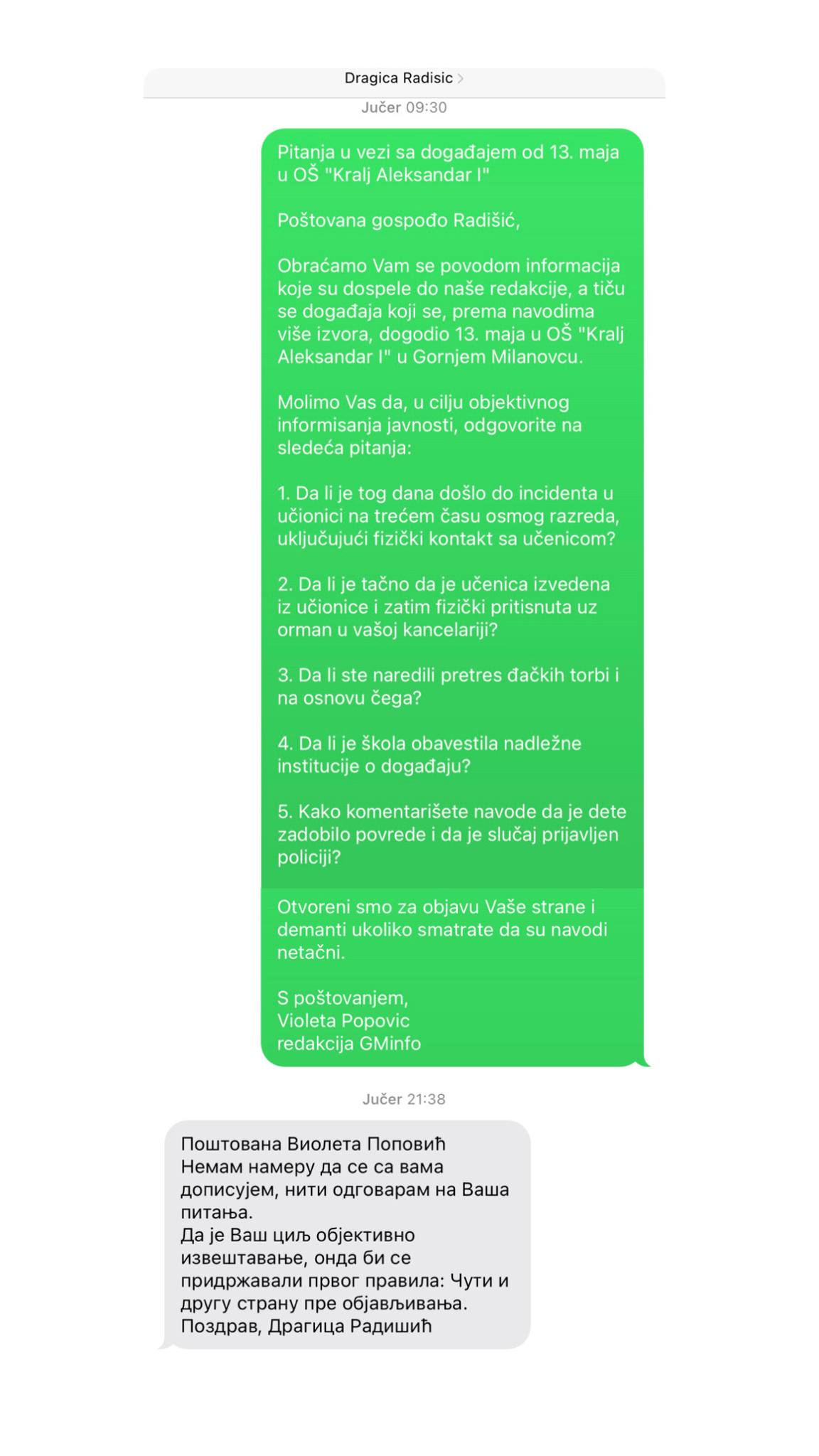 Dragica Radišić direktorka OŠ „Kralj Aleksandar I“ u Gornjem Milanovcu oglasila se kasno sinoć i redakciji portala GMinfo uputila poruku u kojoj navodi – „Nemam nameru da se sa Vama dopisujem, niti odgovaram na Vaša pitanja. Da je Vaš cilj objektivno izveštavanje, onda bi se pridržavali prvog pravila: Čuti i drugu stranu pre objavljivanja. Pozdrav, Dragica Radišić“