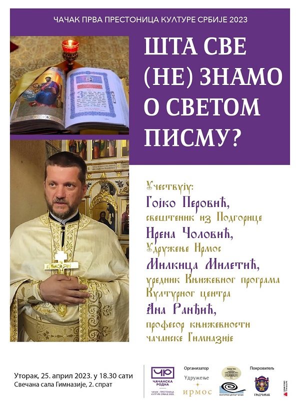Udruženje Irmos, Gimnazija Čačak i Kulturni centar Čačak pozivaju na predavanje sveštenika Gojka Perovića pod naslovom „Šta sve (ne) znamo o Svetom Pismu?“.